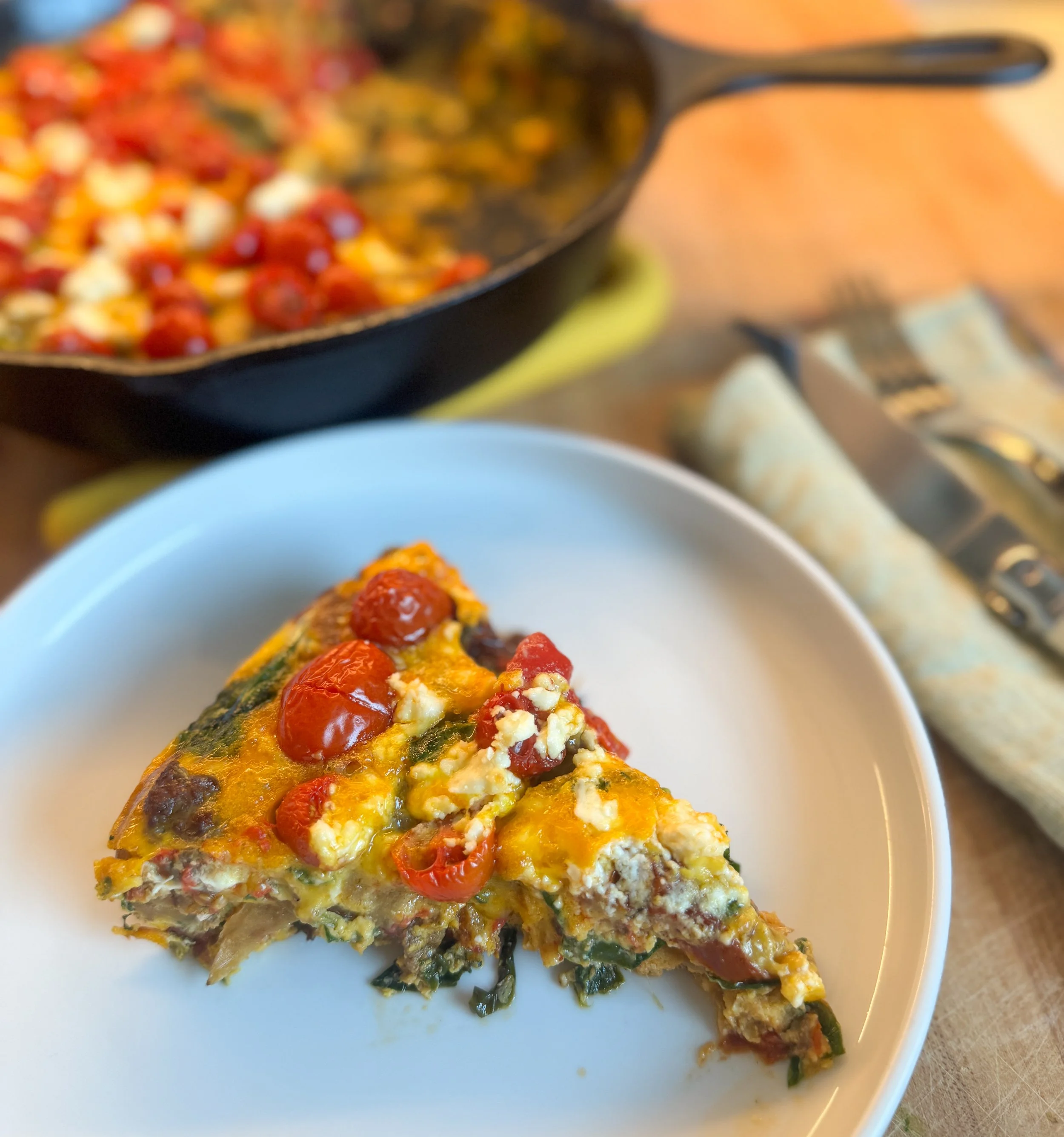 This protein-packed, nutrient-dense Mediterranean frittata was inspired by a Color Club member’s suggestion for a new recipe to get more meat, veggies and protein first thing in the morning. This recipe has been PERFECTED (in my opinion at least) with a key tip from The Food Lab by J. Kenji-Lopez-Alt—deeply caramelized onions in just 15 minutes. I’ve included a short video in the how to do it section below.