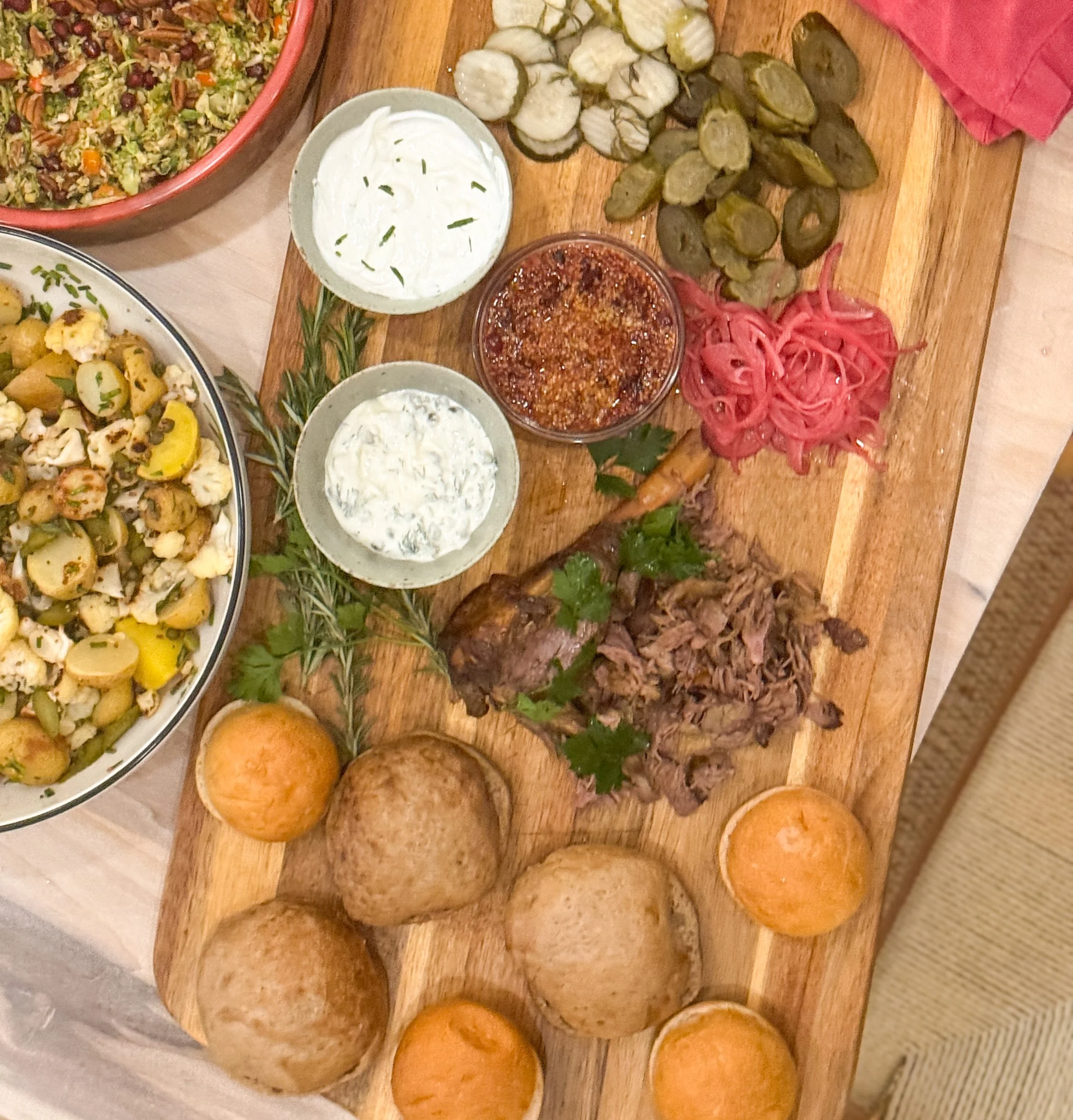 What I adore about this slider bar is its versatility — it caters to all tastes and dietary preferences. It’s like a blank canvas begging for colorful and fun additions. I love to highlight a standout protein, and for this gathering, we’re going all out with braised lamb shanks. You can easily complement your spread with a store-bought rotisserie chicken or a holiday ham. Feeling adventurous? Whip up your own sauces and spreads, or grab your favorite store-bought versions to save time so you can enjoy the company around the table!