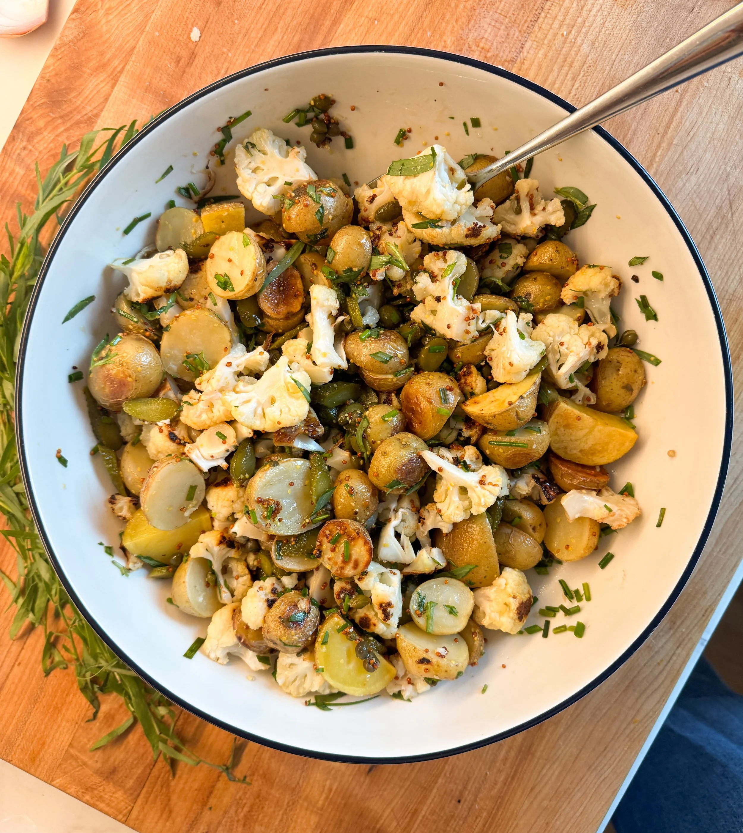 Once your potatoes and cauliflower are cooked, let them cool just enough so that you can handle them. I like to mix the salad together while the vegetables are still warm because the heat allows the vegetables to absorb more of the dressing, giving them more flavor. Add the cornichon brine, mustard, and olive oil. Mix until everything is evenly coded, taste and add salt if needed.