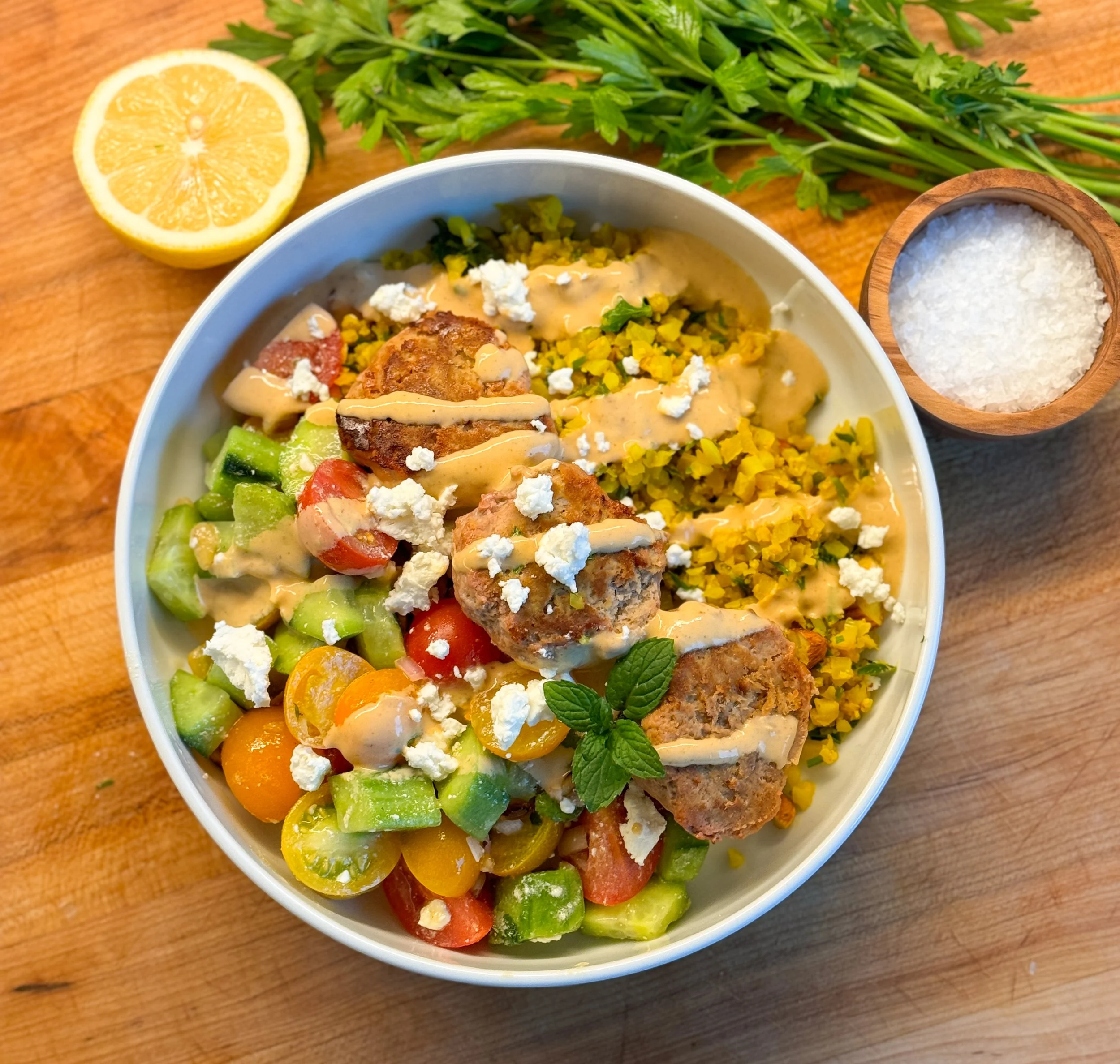 Spicy Tahini Meatball Bowls with Tomato, Cucumber and Pine Nuts