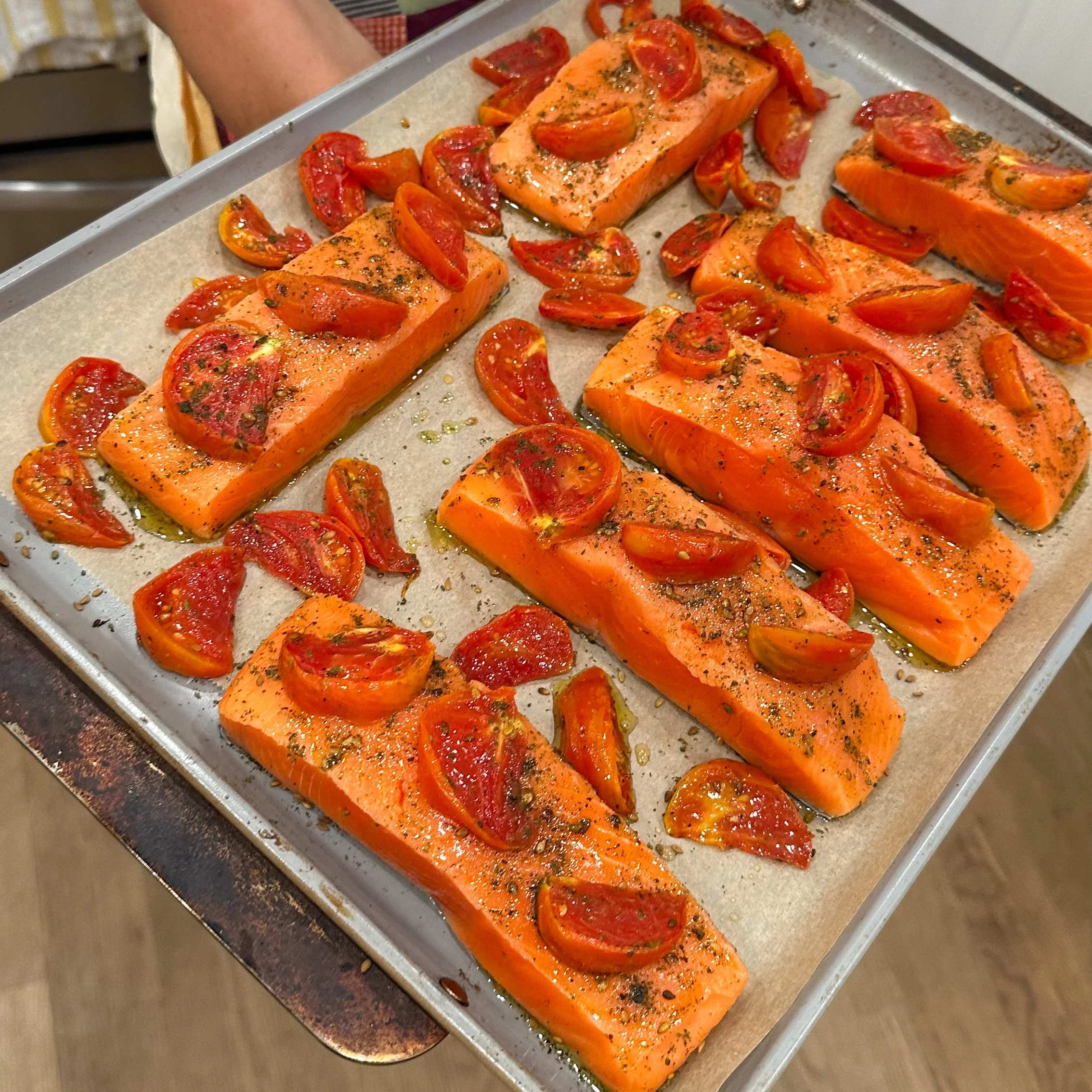 Remove the tomatoes from the oven and add the salmon by nuzzling it into the tomatoes, adding a few on top of each piece as well.